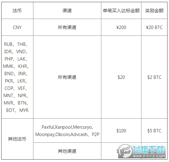購買數字貨幣任務: 使用法幣購買數字貨幣的單筆訂單金額達標后,可領取比特幣獎勵。使用不同國家法幣、通過不同渠道買入時,任務達標金額和獎勵不同。任務將可能動態調整,以下參數僅作為參考: